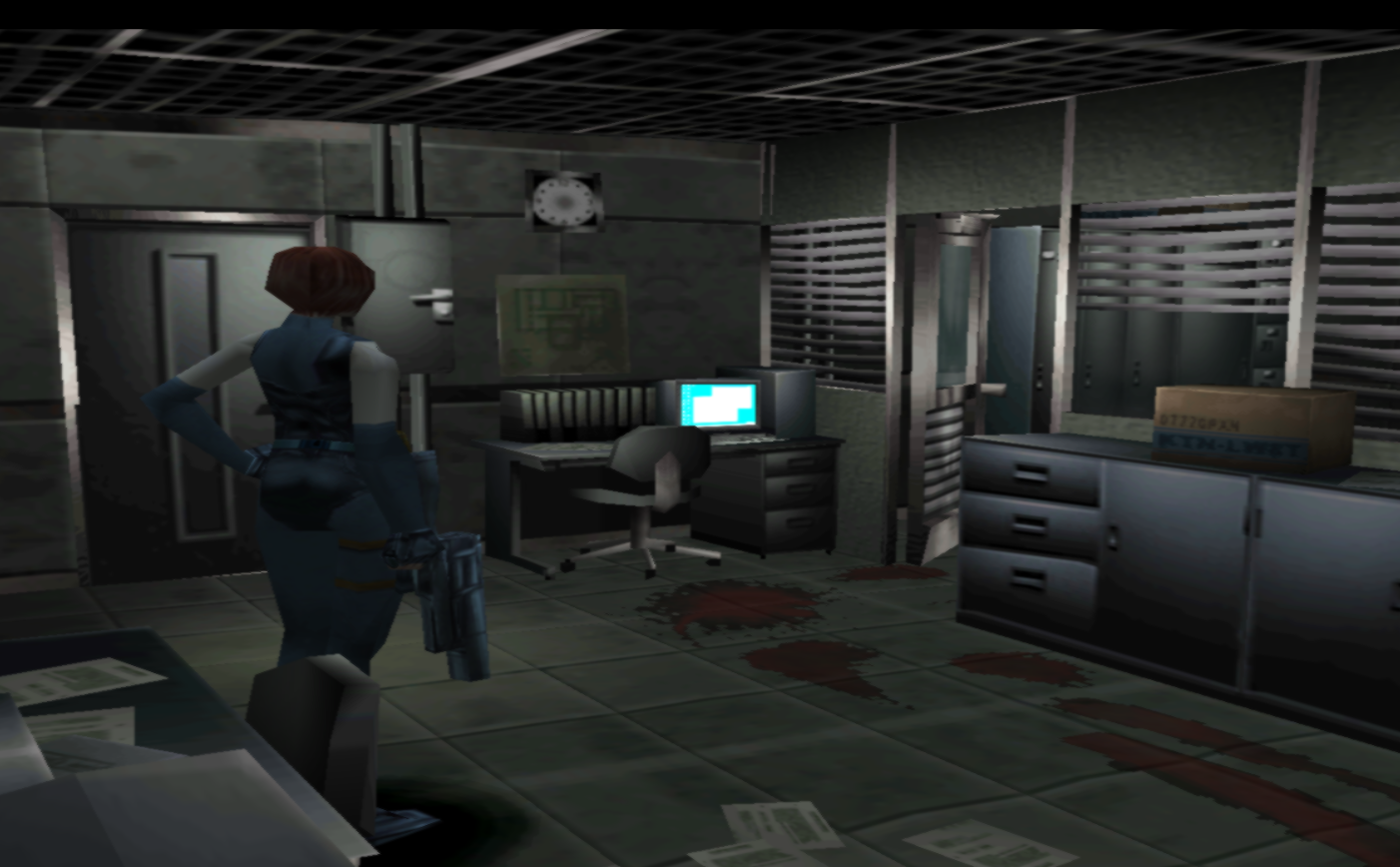 Dino Crisis features survival horror gameplay that is very similar to Capcom's early Resident Evil titles. Regina can walk, run, turn, backpedal, push and climb objects, and perform a 180-degree turn. A map is available which will show Regina's location, destination, save points, and locked doors. Save points are rooms which will prompt the player to save upon exiting them. Some doors are locked by a D.D.K. (digital disk key) device. To open these doors, the player will need both a code disc and input disc which can then be used to decipher a code and unlock the door. There are also force fields of red beams throughout the complex which can be activated to block access to intruders.